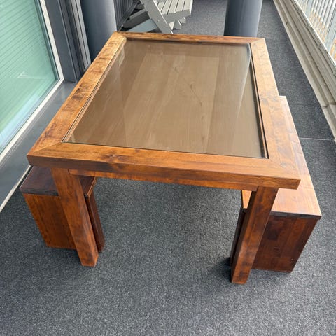 Kotimainen tumma tukeva koivupöytä. Käytönjälkiä löytyy. Jalat irrotettavissa kuljetusta varten