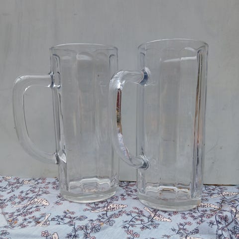 Vaalean sinisellä pohjalla ehjät lasit,yhdessä lasissa pienen pieni valuvika reunassa,jota ei huomaa laisinkaan eikä ole terävä. Vetää 40cl. Vain nouto.