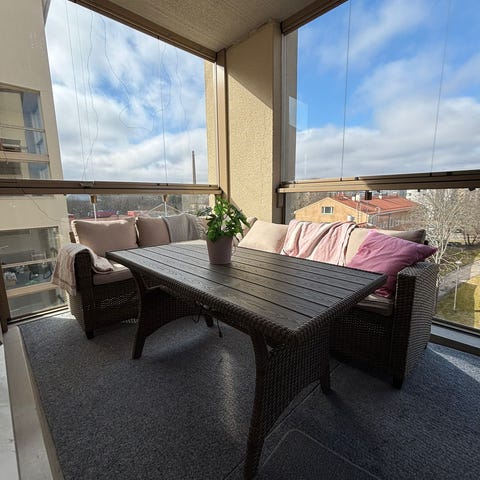 Hyvin palvellut kalustesetti kaipaa keväthuoltoa, pesua ja paikkamaalaustakin jos niin haluaa. Pehmusteet on uudemmat, hankittu n vuosi sitten.