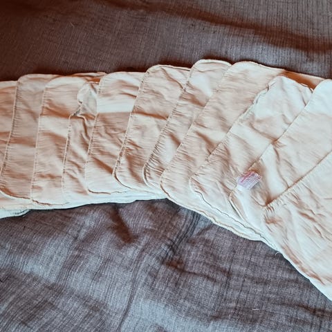 Kolme Geffenbabyn imua, 60% hamppu, 40% puuvilla. Yhteen imuun jäänyt pesussa hieman vaaleanpunertavaa väriä. Rakeita imun sisällä, ei vaikuta imukykyyn ja hyvin imuisia ovat. Reunoissa jo hieman kulumaa.