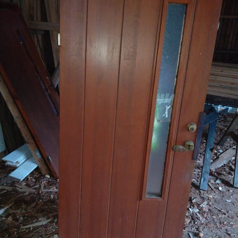 Vihreä ulko-ovi, jossa suorakaiteen muotoisia ikkunapaneeleja. Ovessa on lukkorunko paikallan. Ei kahvaa ja lukkopesää. Karmin leveys 97cm,korkeus 217cm
