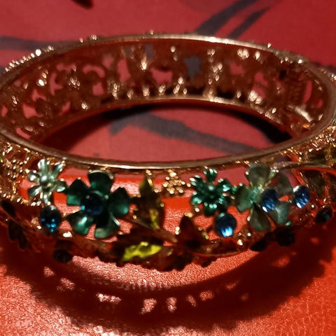 Erittäin kauniit korvakorut, joissa on pisaranmuotoinen metallikehys ja etupuolella sininen ruusukukkakoriste. Taustapuoli on sileä ja tummasävyinen. Materiaali vaikuttaa olevan korumetallia ja posliinia. Kunto on uusi, ilman vikoja.