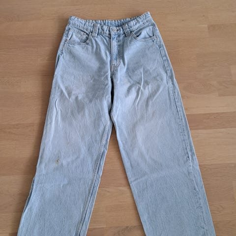 Paperbag-tyyliset Zaran farkut, joissa on joustava rypytetty vyötärö ja kaksi taskua edessä. Lasten kokoa 164, mutta on sopinut myös XXS-XS-kokoiselle aikuiselle.