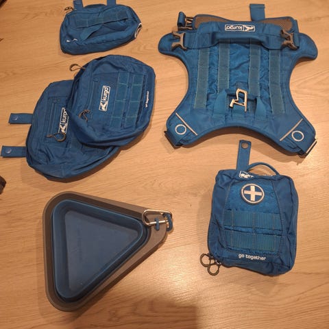 Kurgo taitettava kolmionmuotoinen juomakuppi koiralle. Kuppi on valmistettu joustavasta, sinisestä materiaalista ja se taittuu sisäkkäin useaan osaan, mikä helpottaa säilytystä ja kuljettamista. Mukana on metallinen karabiinihaka, jolla kupin voi kiinnittää esimerkiksi reppuun, taluttimeen tai vyöhön. Soveltuu koiran juomakupiksi ulkoiluun, retkille ja matkalle.