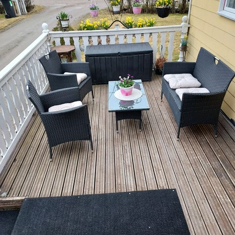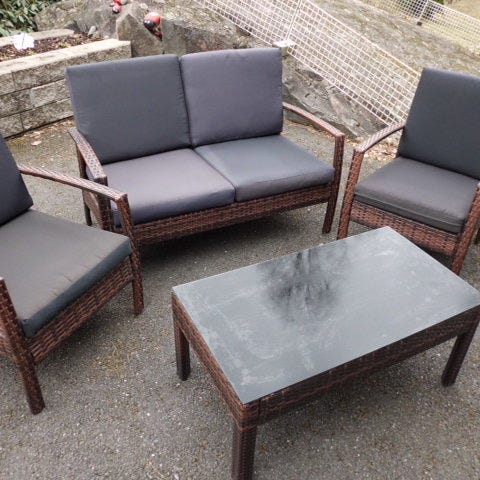 Polyrottinkinen kolmen istuimen terassikalustesetti beigeä polyrottinkipunosta. Sohva koostuu useammasta moduuliosasta, jotka eivät ole kiinni toisissaan, eli saa rakenneltua mieluisat yhdistelmät tai käyttää erillisinä. Rakenne soveltuu ulkokäyttöön terassille tai parvekkeelle. Hyvässä kunnossa!