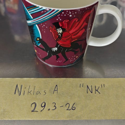 Muumin taikuri muki. Tullut ostettua vahingossa tuplat. En mielelläni postita, että säilyy ehjänä.