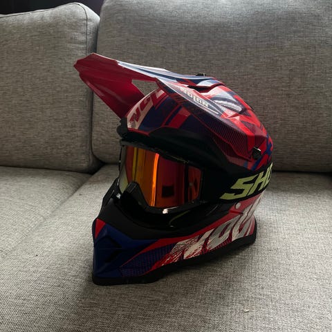Airoh motocrosskypärä musta. Kypärässä on pitkä lippa ja täyskypärämalli, joka suojaa leukaa ja päätä. Sisäosat ovat pehmustetut ja hengittävät. Leukahihnassa on tuplad-lukitus. Muutamissa kohdissa kuluma jälkiä. Kypärää ei ole kuitenkaan tiputettu tai kaaduttu. Kokoa L.