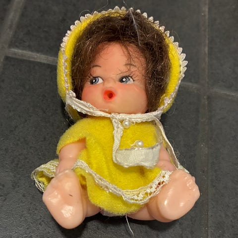 Nukke, jolla on vihreä langasta tehty tukka ja silmälasit. Nukella on sininen kukkakuvioinen pusero, tumma hame sekä vaalea essu pitsireunuksilla. Korkeus on noin 16,5 cm. Sopii koristeeksi tai leikkikaluksi keräilijälle.