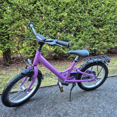 Lasten polkupyörä, jossa 18" renkaat ja violetti runko. Pyörässä on matala runko helpottamaan kyytiin nousua, täyskoteloinen ketjusuoja sekä takalokasuoja. Takana on tavarateline ja heijastin.