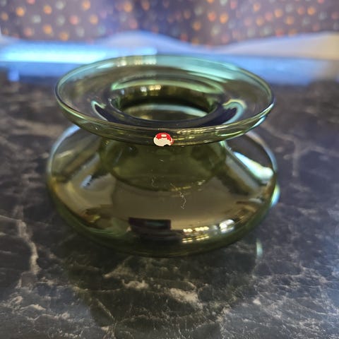 Vanha malja puristelasia, täysin ehjä. Korkeus 20 cm. halkaisija 23 cm, vihrea valo uv-valoissa.
