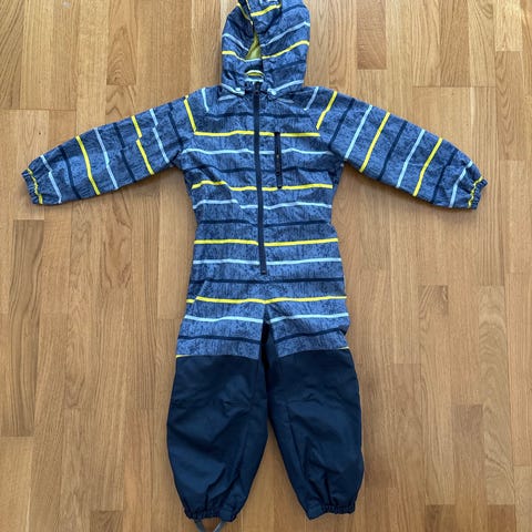 Edessä vetoketjun kohdalla tummentumaa/likaa, joka ei lähtenyt normipesussa pois. Haarakohdassa ihan vähän kulumaa ja vasemman lahkeen sauman kohdalta mustaa väriä kulunut osin pois. Jalkalenksut puuttuu ja toisesta lahkeesta puuttuu toinen nappi. Muutoin hyvässä kunnossa ja loistava haalari välikauteen.