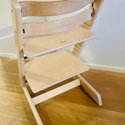 Stokke Tripp Trapp syöttötuoli. Ollut käytössä yhdellä lapsella vauvaiästä 7-vuotiaaksi. Paikoitellen maalipinnassa kolhuja, kuten kuvista näkyy.