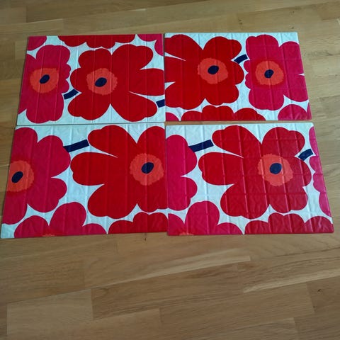 Muhkea, harmaa parisängyn päiväpeitto. Tilatut ruudut ja välissä vanua tms. Muutamista kohtaa tikkaukset lähteneet purkautumaan. Muuten ehjä. Väri hieman tummempi kuin kuvissa.