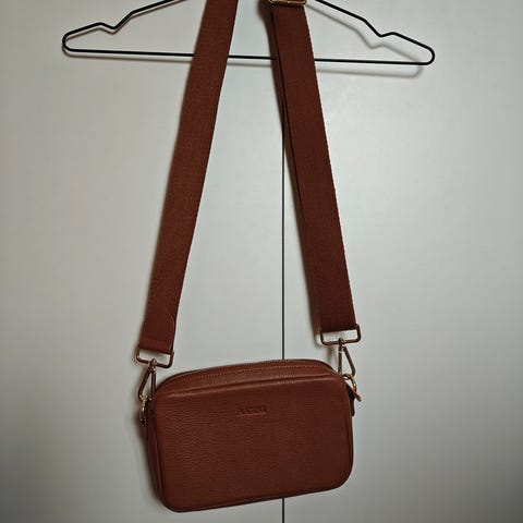 Käyttämätön Aarnin hirvennahkainen olkahihna, väri taupe ja hopean väriset metalliosat. Olkahihnan pituus 58cm, leveys 15mm.