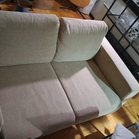 Vuodesohva uuteen kotiin muuton tieltä. Vuodemekanismi mahdollista levittää puolet erikseen tai yhtä aikaa, näppärä pieneen tilaan. Mukava istua ja nukkua. Kahvitahra pesty toisesta nukkumaosasta, josta jäänyt pieni värivirhe. Toisen nukkumaosan pohjassa murtuma, ei haittaa käyttöä. Sohva n. 80 kg.