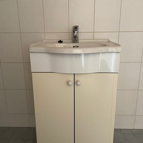 Valkoinen allaskaappi, jossa kaksi ovea ja metallijalat. Kaapissa on ylhäällä taso, jossa aukko pesualtaan ja viemäriputkien kohdalle. Sisällä on yksi hyllytaso säilytystä varten. Sopii kylpyhuoneeseen pesualtaan alle pesu- ja puhdistusaineiden tai muiden tarvikkeiden säilytykseen. https://www.ikea.com/fi/fi/p/nysjoen-allaskaappi-2-ovea-valkoinen-50470814/ muuton alta pois, vain nouto
