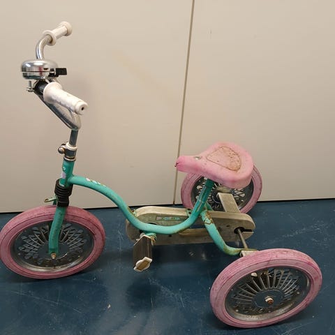 Lasten polkupyörä, jossa 12" renkaat. Rungon väri on pinkki. Pyörässä on etukori, takatavarateline, soittokello sekä työntöaisa aikuisen avustamista varten. Satula on säädettävissä istujan pituuden mukaan. Ruostetta ja hyvä tuunailtavaksi.