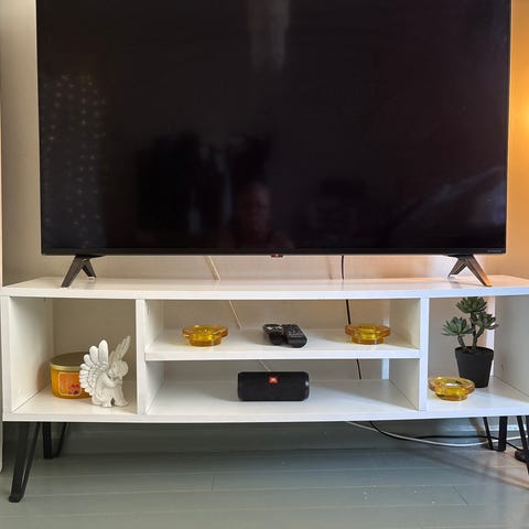 Hyväkuntoinen, avoin tv-taso. Tummanharmaa mustin metalliyksityiskohdin.