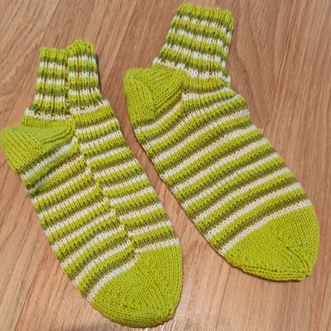 Omatekemät sukat, villa 80% / polyamidi 20%. Konepestävät. Pohja 23cm ja ympärys 20cm venyttämättä.