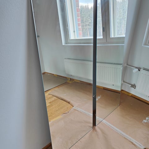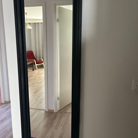 Myydään peili, jossa mustat kehykset.