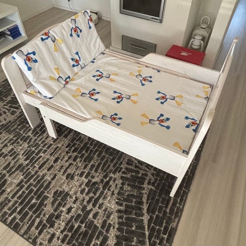 IKEA jatkettava lastensänky valkoisena. Sängyssä on jatkettava runko, jonka pituutta voi säätää lapsen kasvaessa. Materiaalina maalattu puu/puukuitulevy. Sopii lastenhuoneeseen juniori-iästä eteenpäin. Kuvissa näkyy myös sänkyyn sopiva jatkettava patja.