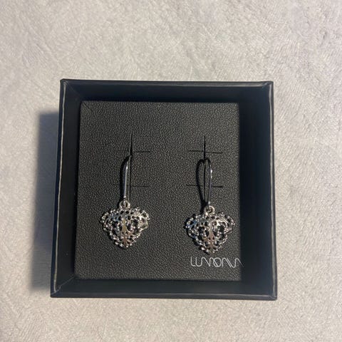 Lumoava Bella isot korvakorut. Korkeintaan kerran olleet käytössä, tummuneet ajan saatossa hiukan mutta saa varmasti puhdistettua. Nämä on vanhempaa tuotantoa olevat isommat riipus sydänkorvakorut. Riipuksen koko on 24x24mm