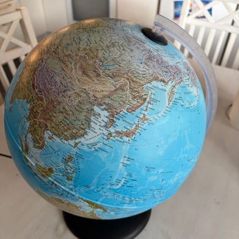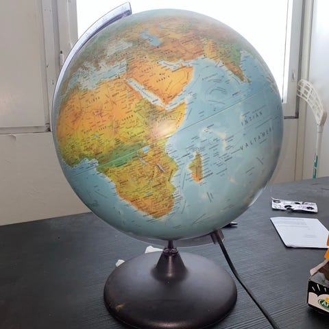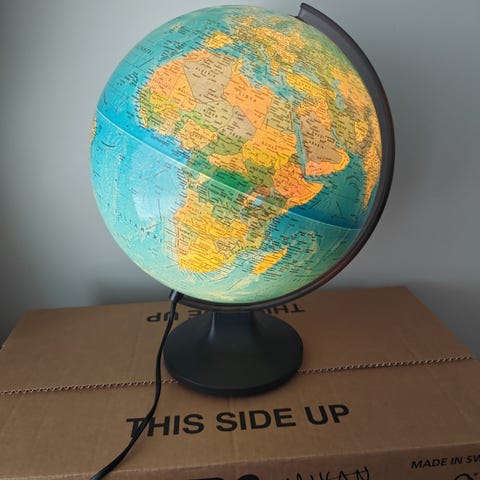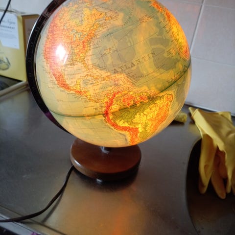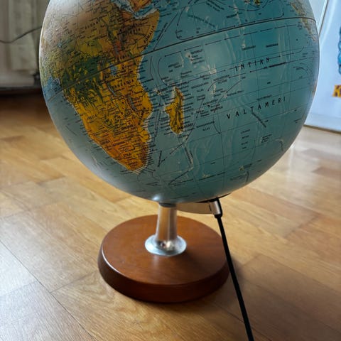 Vanha karttapallo, jossa värillinen kartta ja korkeusvaihtelut korostettuina. Pallo on kiinnitetty metalliseen kaareen ja pyöreään jalustaan, joka seisoo tasolla. Soveltuu esimerkiksi, sisustuselementiksi tai karttakuvauksen havainnollistamiseen. Sähköjohto pitää uusia ja poltin. Vain nouto.