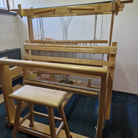 Puinen kangaspuut-tyyppinen kudontalaite kotikäsitöihin ja pienimuotoiseen kudontaan. Soveltuu erilaisten tekstiilien, kuten mattojen, liinojen ja huivien kutomiseen. Rakenteessa on puinen runko, loimilankojen pidike sekä polkimet sidosten vaihtamiseen. Mukana on erillinen puinen istuin. Laite on tarkoitettu käsikäyttöön ja vaatii tilaa sisäkäyttöön. Viime aikoina vähällä käytöllä. Lämpimässä säilytetty.