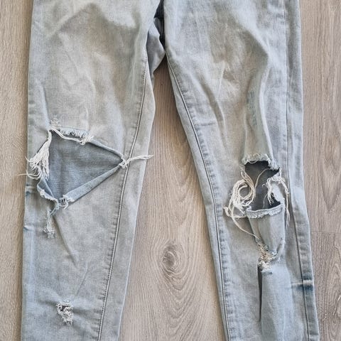 Malli: mom jeans eli kapenevat lahkeet ja ultra high waist, tosi korkea vyötärö.