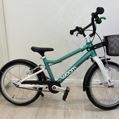 Woom 3 16" lasten polkupyörä. Pyörässä on käsijarrut edessä ja takana, seisontatuki sekä lokasuojat.