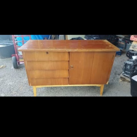 Valkoiseksi maalattu vanha puuviilu senkki. 2 avainta mukaan. Korkeus 82 cm, leveys 147,5 cm ja syvyys 46 cm.