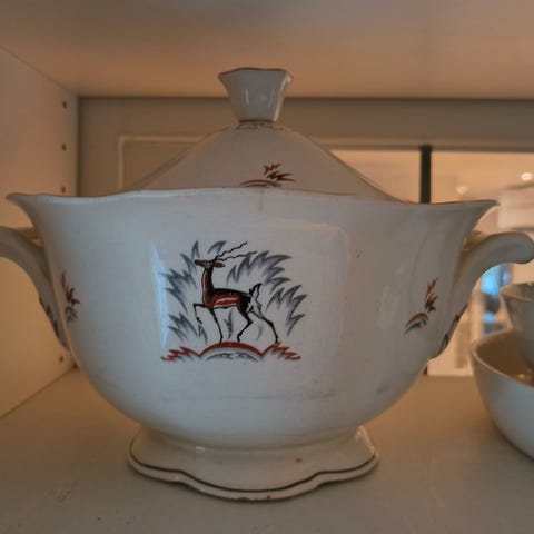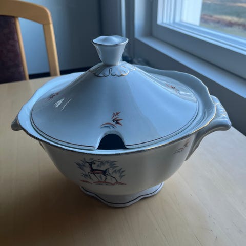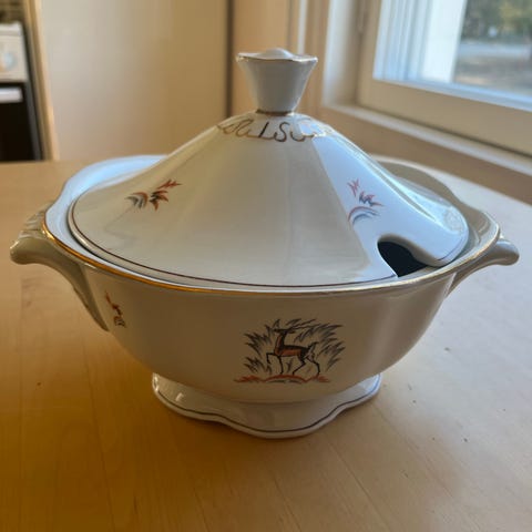 Arabian Kauris-sarjan soppakulho. Korkeus kannen kanssa 19, pituus 35 ja lev 20.
