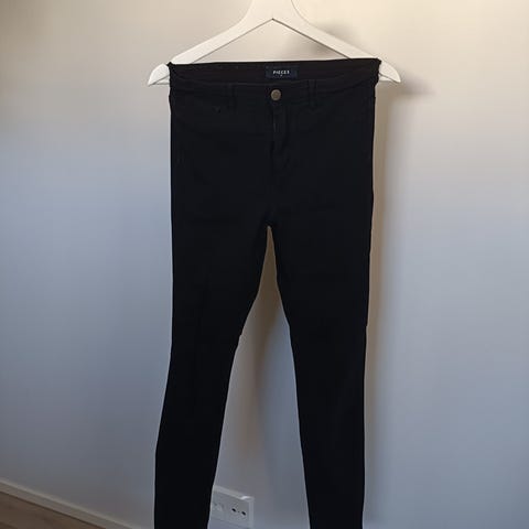Mustat, joustavat piecesin housut. Ehjät ja siistit. Väri on hieman haalistunut. Pesukonevärillä voi halutessaan viimeistellä värin.