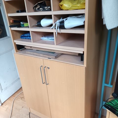 Leveys 30, korkeus 57, syvyys 23 cm. Jokunen pieni naarmu on, mutta ei niitä huomaa jos ei etsi.