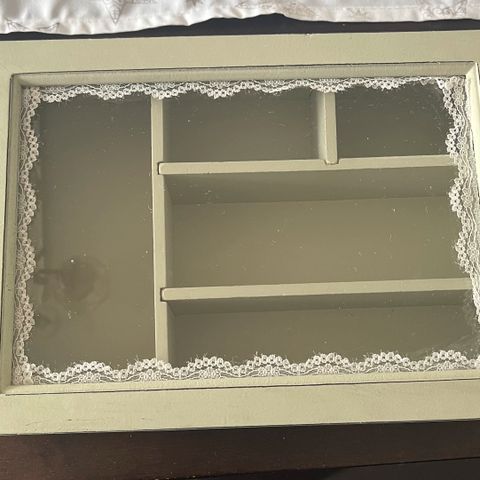 Kaunis laadukas valkoinen korurasia, jossa on peilikansi ja koristeelliset metalliset koukeroaiheet kannen pinnassa. Sisäosassa on peili, pehmustettu lokero esimerkiksi sormuksille sekä avoin säilytyslokero muille koruille. Alaosassa on erillinen vetolaatikko lisäsäilytystilaa varten.