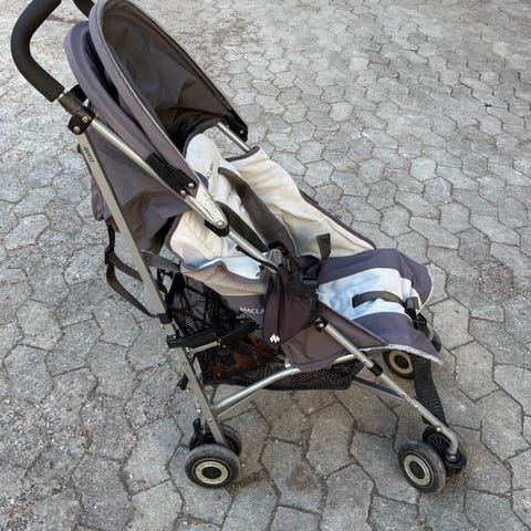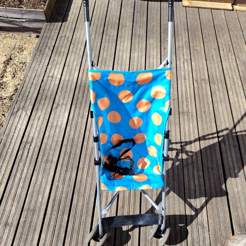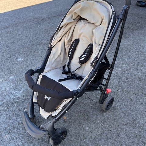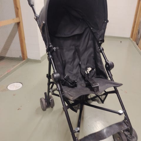 Myydään hyvässä kunnossa olevat matkarattaat punaisella päivävarjolla.