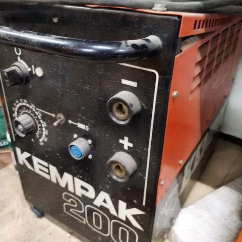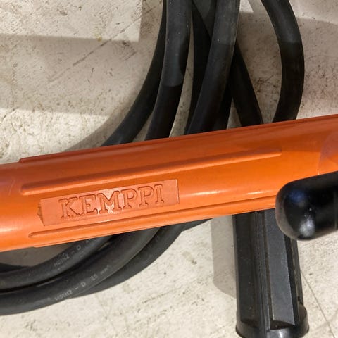 Kemppi TOP hitsausmuuntaja. Etupaneelissa on virransäätö, jossa asteikko on jaettu eri elektrodikokoille (1,6–2,0 mm, 2,0–2,5 mm, 2,5–3,25 mm). Laitteessa on virtajohto pistotulpalla sekä hitsauskaapelit elektrodipidikkeellä ja maadoituspuristimella. Kuvissa näkyy lisäksi Lincoln Electric -hitsauspuikkopaketti, joka kuuluu kokonaisuuteen. Eli myydään mukana.