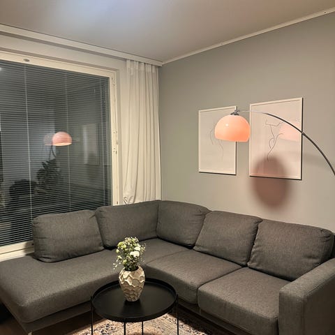 Sohva on hyvin siisti, kaikki päälliset juuri pestyjä. (Kaikkien tyynyjen päälliset saa pois pestäväksi) Koristetyynyt ei myynnissä.