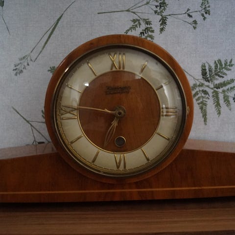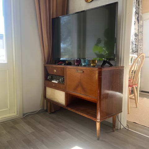 Pöytäradio, lev 75 cm, kork 22 cm. Vetokello avain tallella, käy vedolla 2-3 viikkoa. Lyönnit varttitunnin välein ( saa pois). Kunto hyvä.