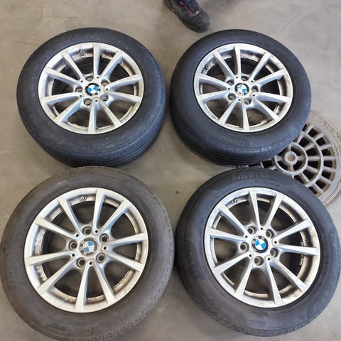 Hyvät kesärenkaat hyvillä alkuperäisillä vanteilla. Yksi rengas vuotaa, tullut reikä sisäpuolen runkoon, katso kuva. Muutoin hyvä sarja, tasaisesti kulunut, n.5mm pintaa kaikissa. Ja huom! Vanteet ovat siistit, toki hieman pölyiset koska oli pari päivää alla, mutta pestyt ja siistit, ei kanttariosumia.