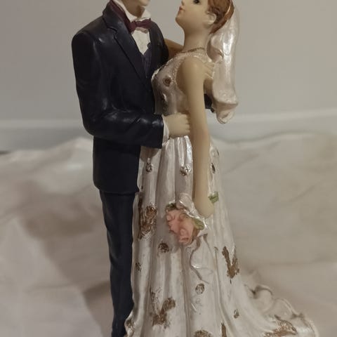 Hääpari koristefiguuri, jossa morsian ja sulhanen seisovat vierekkäin. Morsiamella on yksityiskohtainen valkoinen hääpuku ja kukkakimppu kädessä, sulhasella tumma puku ja rusetti. Materiaalina kova massa. Kevyt. Sopii esimerkiksi kakunkoristeeksi tai hääaiheiseksi sisustusesineeksi.