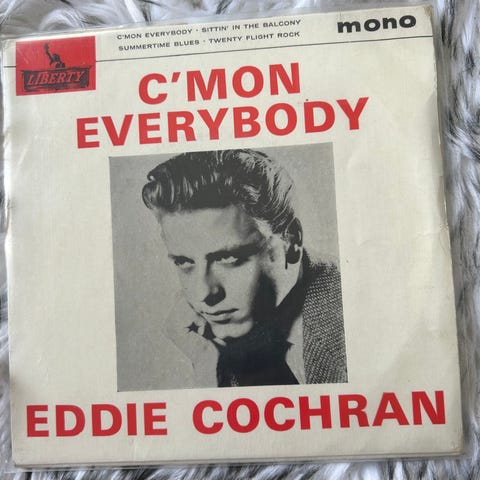 Eddie Cochran 20th Anniversary Special vinyylilevy, 7" single/EP-muotoa. Julkaisija Rock Star -levymerkki. Mono-äänite,