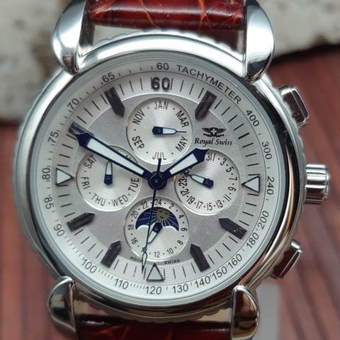 Merkki: Chronographe SuisseLiike: Mekaaninen käsiveto Calibre: Landeron 48Kehys: Plaqué kultaaTila (Kehys): Erittäin hyväKoko (Kehys): 39 mm (maaliskuulla)Koko (Kehys): 37 mm (ilman kruunua)Tila (Lähtölaite): RestaurerattuLasi: Erittäin hyväKruunu: YleiskäyttöinenHihna: UusiSolki (Hihna): YleiskäyttöinenHihnan paksuus: 18 mmKokonaispituus: 22 cmToimitus UPS:n kautta.HUOM:Mikä tahansa maahantuojan maihin sovellettavat tullimaksut tai verot vastaavat ostajan vastuulla.Kuljetusaika vaihtelee maiden mukaan; yleensä 1-3 arkipäivää Euroopassa ja enintään 5 arkipäivää Euroopan ulkopuolella.Kuvat edustavat kokonaisuudessaan myytävää kelloa, joten on suositeltavaa tarkastella tarkkaan kaikkia havaittavia yksityiskohtia, koska myyjän arviolla ei välttämättä ole sama kuin ostajan.Jos et ole samaa mieltä ehtojen kanssa, älä tee tarjousta.