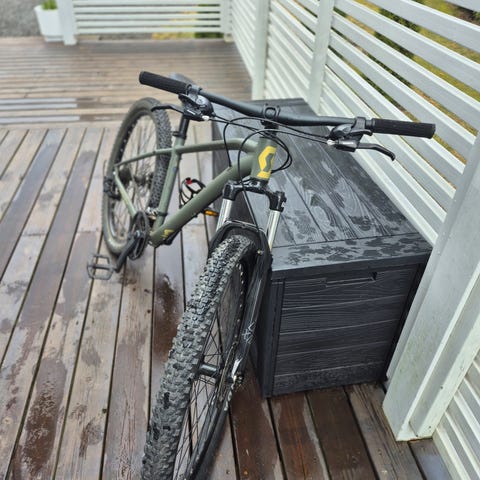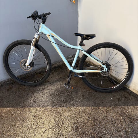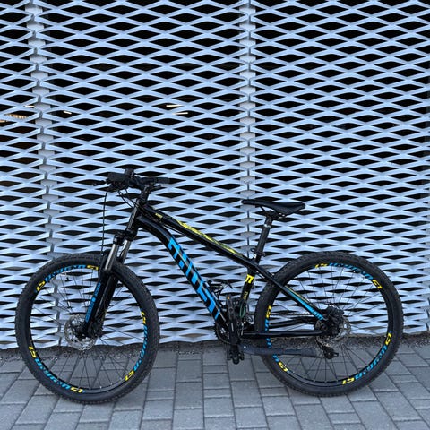 Pyörässä on neste levyjarrut, rungon koko on S (runkoputken korkeus 40cm) ja renkaat ovat uuden veroiset.