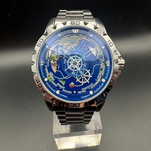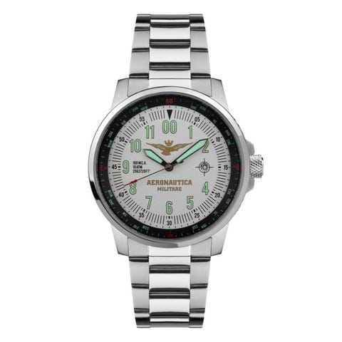 Aviation Aviation -V- automaattikellojapanilainen automaattikoneistoruostumattomasta teräksestä valmistettu kotelovedenkestävyys 5 ATM astipäivämääränäyttö klo 3safiirilasikorkealaatuinen canvas-ranneke ruostumattomasta teräksestä valmistetulla nastalukollakotelon halkaisija noin 40 mm (ilman kruunua)hehkuvat tunnit, minuutit, numerot ja indeksitpaksuus noin 10 mmtakakansi ruuvatturannekkeen kokonaispituus noin 21 cmerinomainen kunto, käyttämätönvalokuvat kuuluvat kuvaustavakuudellinen toimitus sisältyy