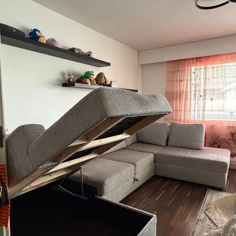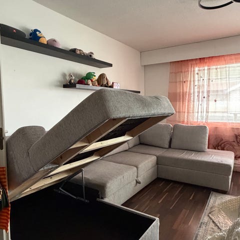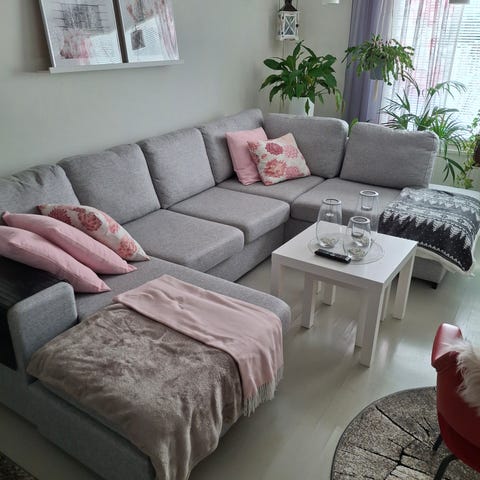 Kulmasohva avopäädyllä. Sohvassa on käännettävät selkätyynyt.