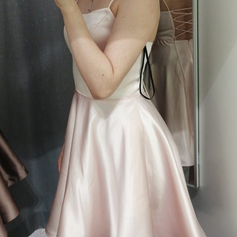 Olkaimeton ja nyöreillä kiristettävä. Mekossa lukee koko 30, eli n. XS (vyötärönympärys ~68cm, löysättävissä ja kiristettävissä nyöreillä)