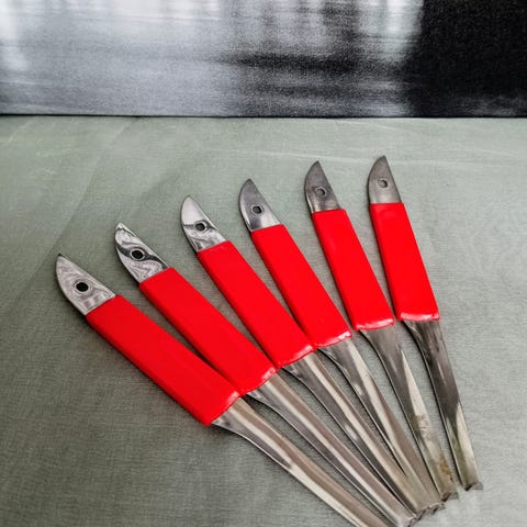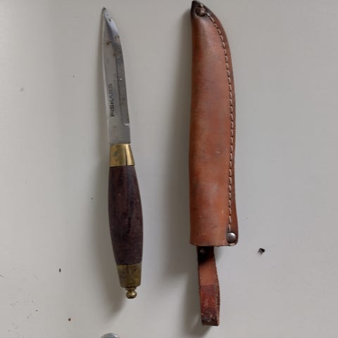 Fiskarsin fileointipuukkoa, jossa on teroittimella varustettu tuppi (malli 8739), valmistettiin pääasiassa 1980-luvun lopulla ja 1990-luvulla.