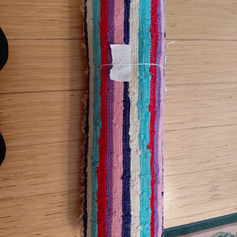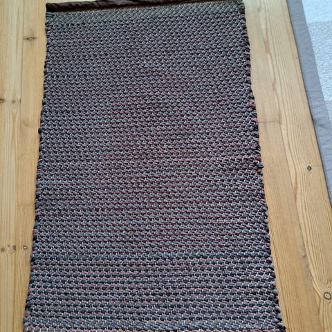 3. Ruskea-keltasävyinen, kotikutoinen räsymatto. Pesty ryhdikäs 85x280 mittainen matto. Hinta 25:-.