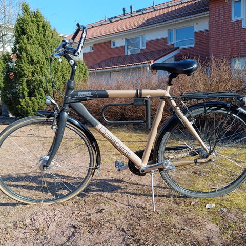 Punainen mammapyörä Crescent-merkkinen, 28". 3-vaihdetta. Runkolukko, valot edessä ja takana. Uutta vastaavat renkaat. Hieno ja huollettu pyörä.